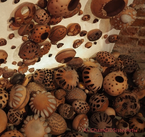 Une fois passées les hautes parois noires, nous découvrons, souffle coupé, l'œuvre monumentale de Zahrah Al Ghamdi. Le pavillon de l'Arabie saoudite est investi par d'imposantes colonnes en papier, illuminées de l'intérieur et sur lesquelles sont accrochées des milliers d'objets en cuir sculpté brûlé (52 000 pièces uniques). L'immersion est totale car on demeure un long moment au centre de ce monde étrange et nouveau. Une bande sonore "sub" et les sons qui s'échappent de certaines sculptures de façon aléatoire parce qu' interactives, contribuent à créer une hypnose.