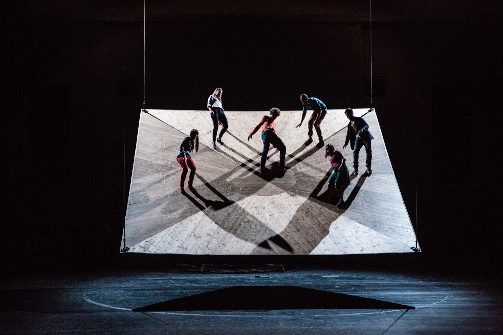 Le plateau représente l'allégorie de l'incertitude et des équilibres instables. Face à ce sol qui se dérobe, l'individualisme n'est plus une option. Les six acrobates-danseurs doivent s'unir, s'enlacer et s'entraider pour survivre à la course folle du plateau. Leur solidarité devient la clé de l'équilibre.