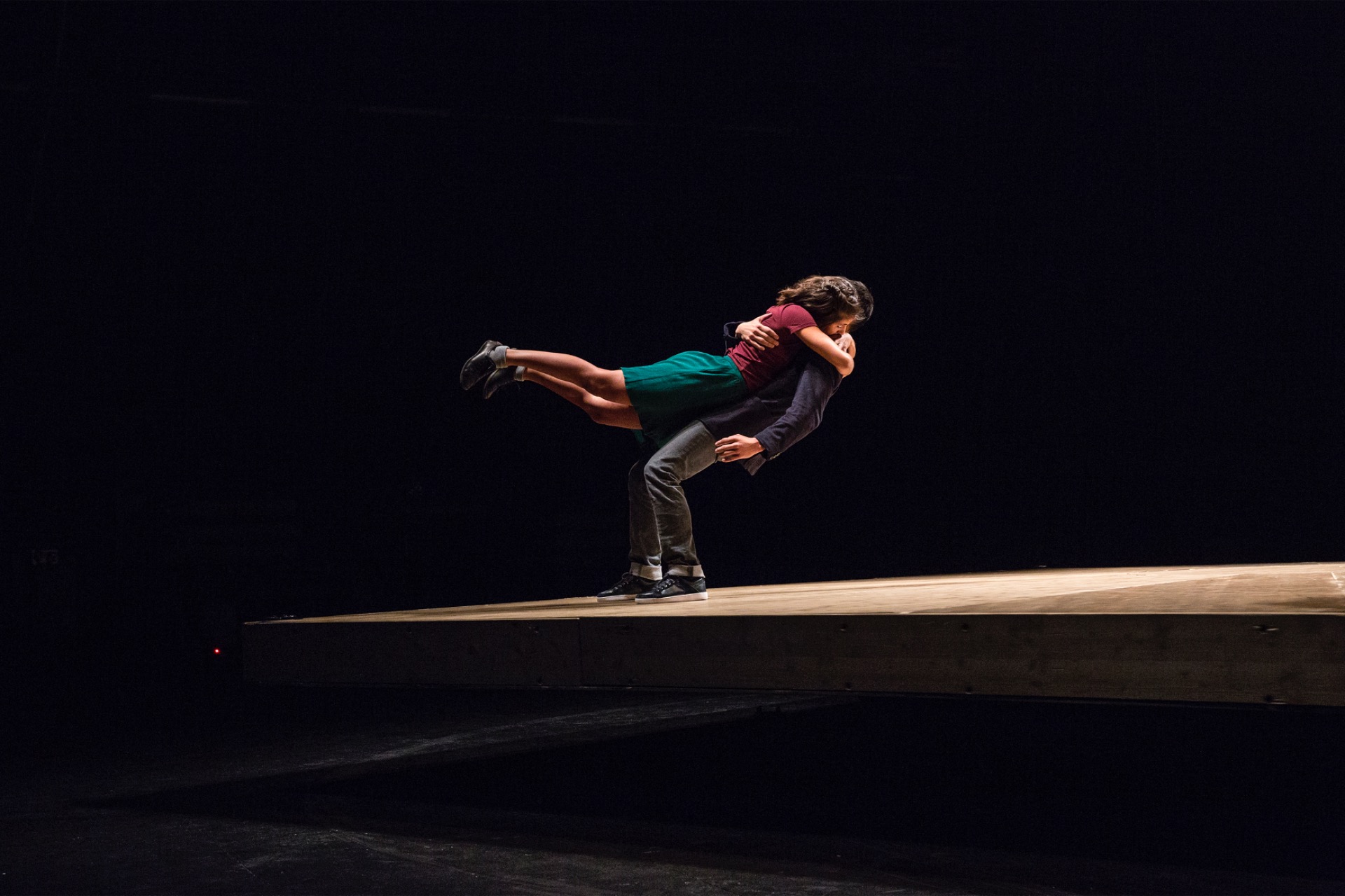 Le levé de rideau laisse sans équivoque. Sur scène, un plateau de bois massif monumental s'impose, six individus l'occupent. Dans l'ombre, un régisseur commande discrètement les possibilités de mouvements du plateau. Dans cette exploration de plateau, les protagonistes prennent l'allure, ici, de marionnettes et là, de personnages animés de conscience et d'émotions. Quand il craque et se déforme, quand il tourne et tangue de façon vertigineuse, le plateau induit la possibilité permanente d'une chute. Pas d'effets spéciaux ni de filet, les acrobates doivent composer avec la force centrifuge et la gravité pour ne pas basculer dans le vide. Dans tous les cas, le public retient son souffle.